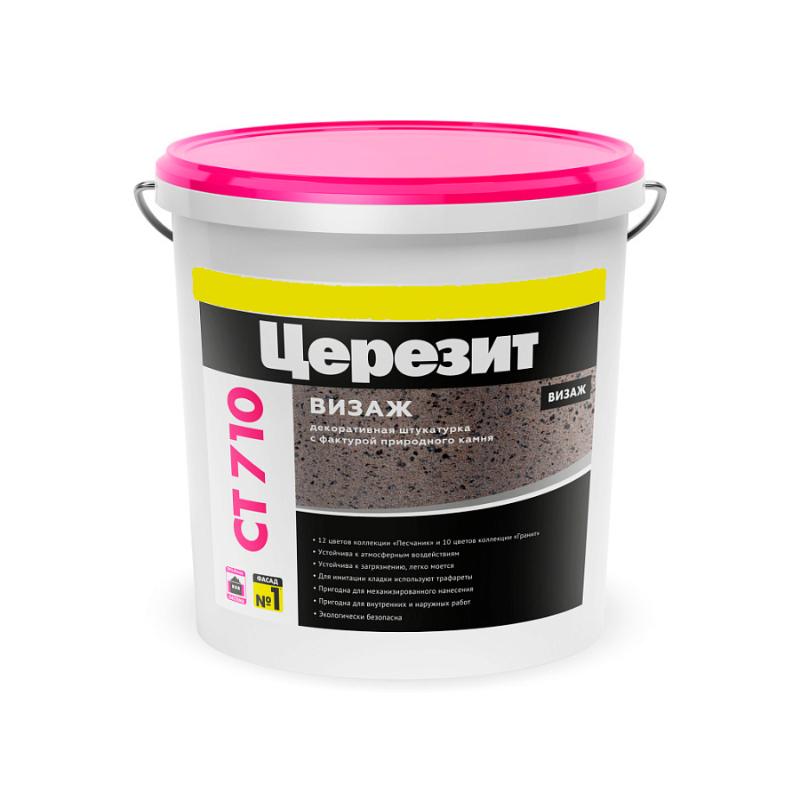 Штукатурка CT 710 Visage предназначена для изготовления тонкослойных декоративных покрытий, имитирующих фактуру песчаника или гранита, на таких основаниях как бетон, цементные и гипсовые штукатурки, гипсокартон, древесностружечные плиты и т.п., а также на базовом штукатурном слое в составе систем фасадных теплоизоляционных композиционных (СФТК) с теплоизоляционным слоем из пенополистирольных плит (Ceresit EPS). Декоративная штукатурка с фактурой природного камня "Песчаник" и "Гранит"